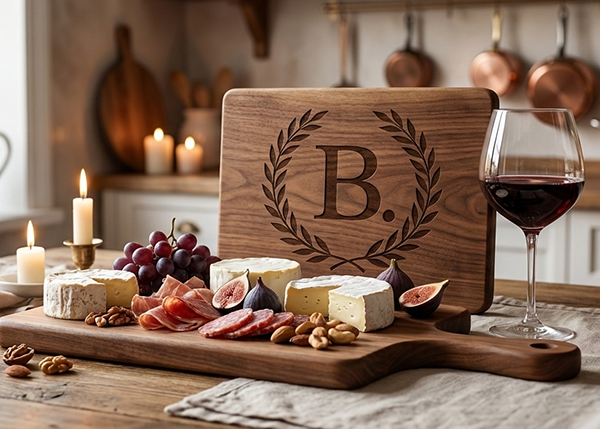Engraved keepsakes — jewelry, cutting boards, and tray tables with names, dates, and meaning